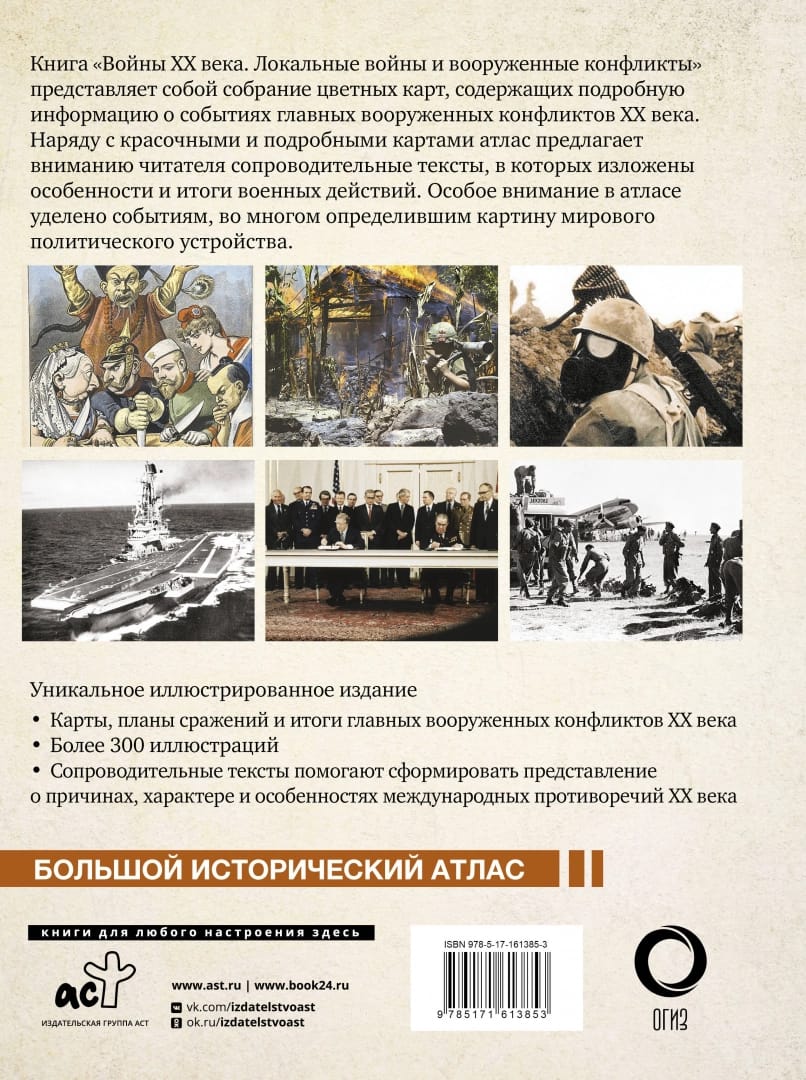The book "Wars of the 20th Century. Large illustrated atlas" is a collection of color maps containing detailed information about the events of the major armed conflicts of the XX century. Along with the maps, the book includes accompanying texts that describe the features and outcomes of military events reflected on the maps, as well as bright illustrations. Special attention in the atlas is paid to the events that largely determined the picture of the world political system.