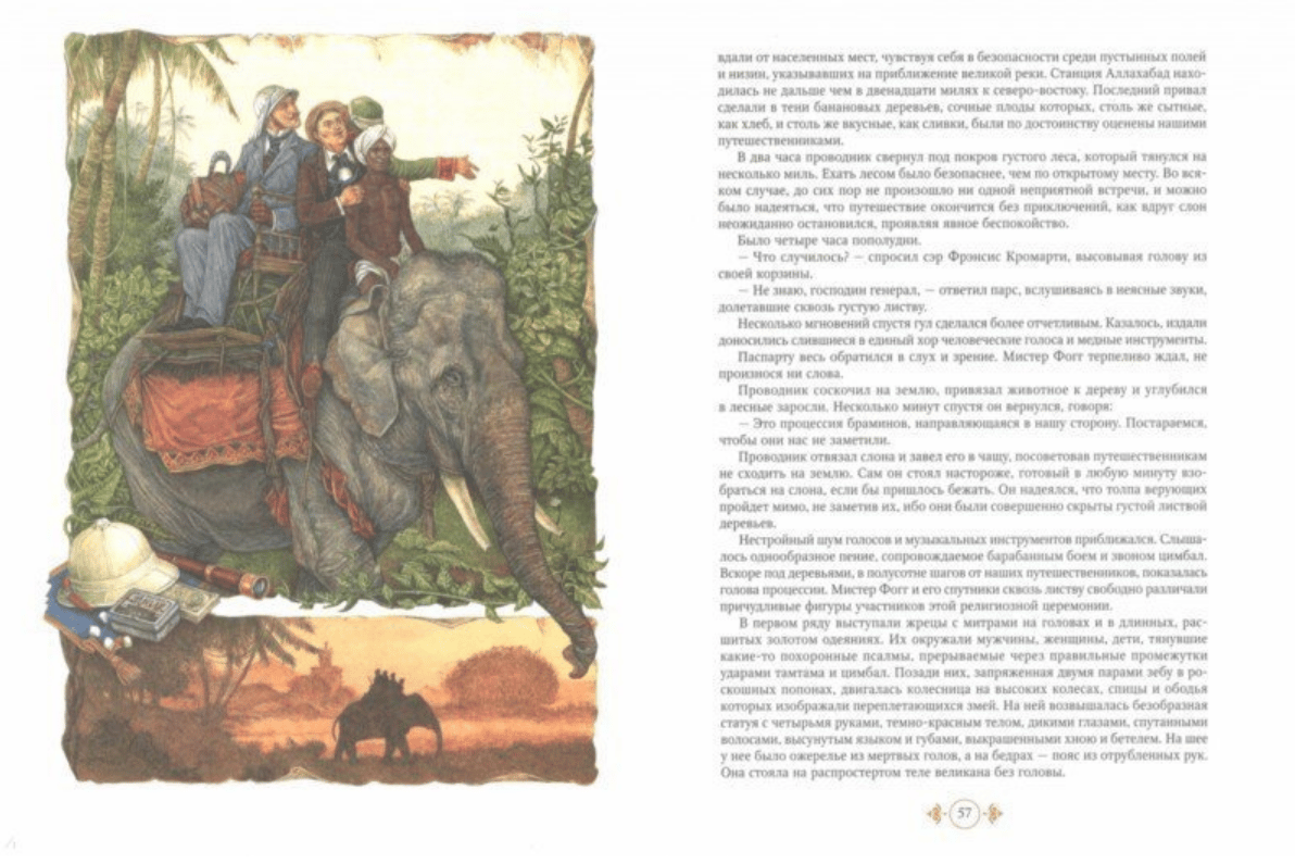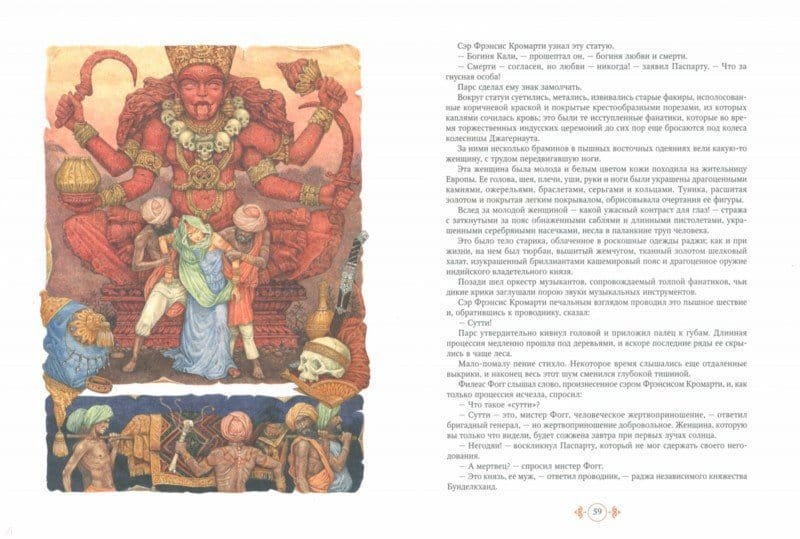 Incredible, full of danger adventures, exoticism of distant countries, extensive description of world geography.... Everything Jules Verne wrote about comes to life in this edition thanks to the remarkable master of book illustration Lev Kaplan. His works are full of details, each of which contains a lot of additional meanings. You plunge into them with your head, and now you yourself are carried away in a humming train on an unforgettable journey, get into a storm on a ship, ride an elephant together with the Englishman Phileas Fogg and his assistant Passepartout, who by all means need to win a bet - to circumnavigate the Earth in eighty days.