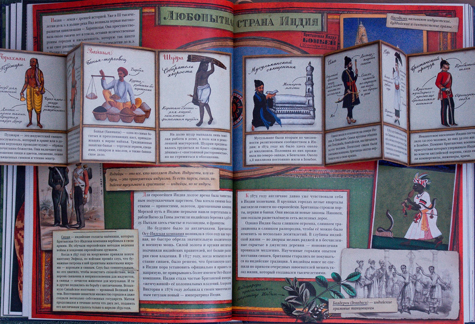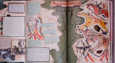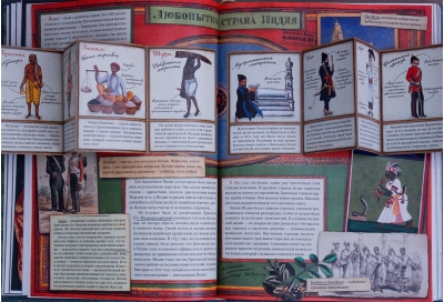 The shady gardens of Singapore and the bustling streets of San Francisco, the Mormon city and the Indian jungle, the snowy expanses of Nebraska and the wondrous Ganges Valley—on thematic spreads, you can explore all of this leisurely and attentively, learn to distinguish a Brahmin from a Kshatriya, a wigwam from a tipi, understand the structure of sailing ships, examine a multitude of amazing costumes, hairstyles, carriages, dwellings, and temples, and compare the route with 19th-century maps.