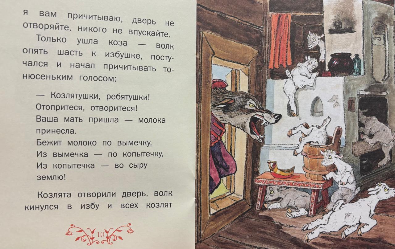 The Russian folk tale of the wolf and the kids holds within it a wealth of folk wisdom accessible to even the youngest readers. This story, familiar to everyone since childhood, is presented in A. Tolstoy's adaptation, and the text is accompanied by unique illustrations by Yevgeny Rachev.