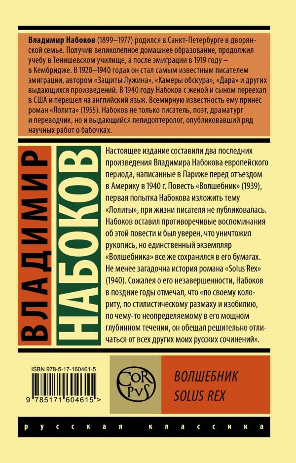 This edition contains the last two major works of Vladimir Nabokov's European period, written in Paris before his departure for America in 1940. Both had a decisive influence on the writer's subsequent English-language work. The story "The Wizard" (1939) was Nabokov's first attempt to expound the theme of "Lolita"; the novel "Solus Rex" (1940) was an approximation to the conception of "Pale Fire." Regretting the incompleteness of "Solus Rex", Nabokov noted that "in its coloring, in its stylistic scope and abundance, in something indefinable in its powerful undercurrent, it promised to be decisively different from all my other Russian works".