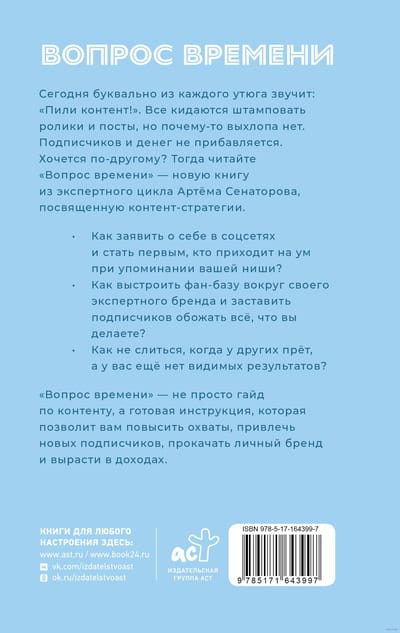 Today, literally from every iron you hear: "Saw content!" Everyone rushes to churn out videos and posts, but for some reason there is no output. Subscribers and money are not increasing. Want something different? Then read "A Matter of Time" - a new book from Artem Senatorov's expert series dedicated to content strategy.