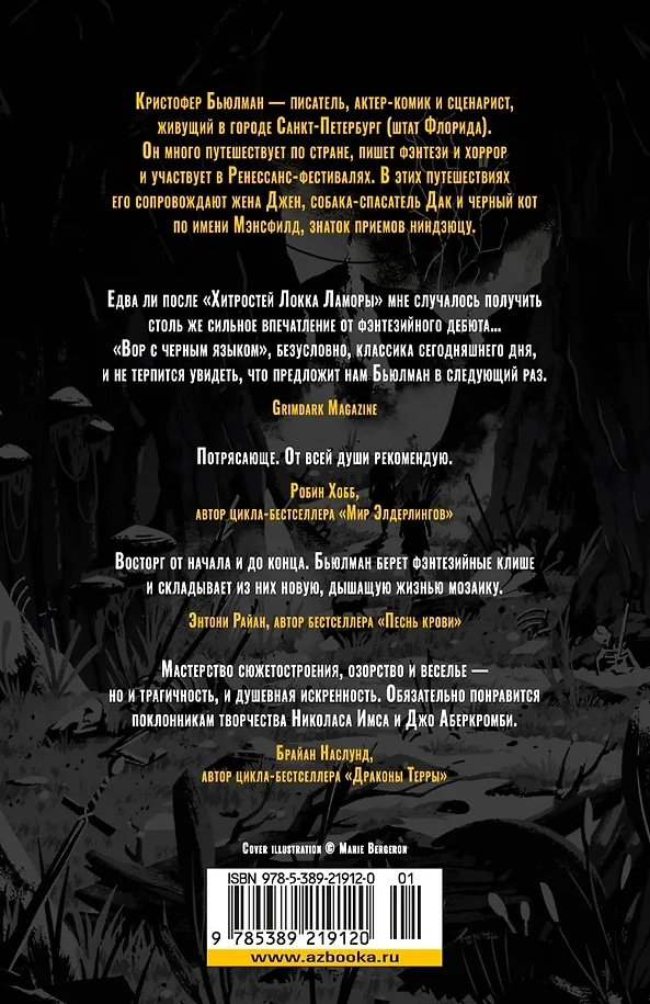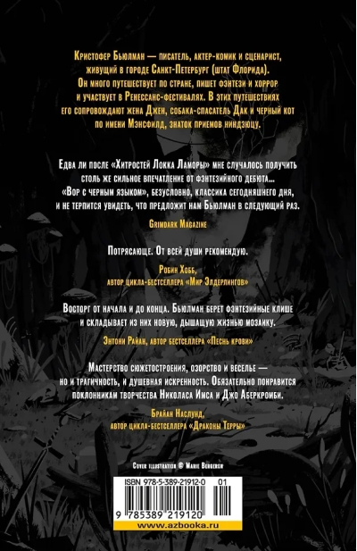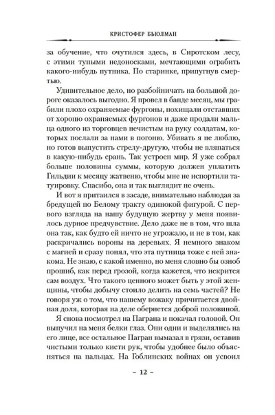 Kinch Na Shannak, like all Galtians, has a black tongue. As a teenager, to avoid being sent to war, Kinch enrolled in the Guild of Takers, or Thieves, where he learned the cunning ways of crime and even acquired some magical skills. But the training comes at a price, so Kinch lies in wait, determined to rob the first person who shows up on the forest road. But the traveler he encounters is anything but harmless. Galva is a female knight, a veteran of the Goblin Wars, and a superb fighter. And she possesses a secret weapon—a corvid, a huge warbird hidden within a magical tattoo. Kinch will not be able to defeat this woman in combat. However, he will have a chance to repay the Guild by completing a very strange task. Galva is en route to the distant kingdom of Austrim, recently attacked by an army of giants. Kinch will have to accompany her, trying to gain her trust, and await further instructions.