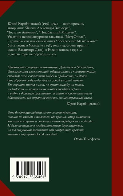 The book “Mayakovsky’s Resurrection” was first published in Munich in 1985 (was awarded the Vladimir Dahl Prize), was published in Russia in 1990, causing a storm of criticism, enthusiastic and indignant responses, making the poet and philologist Yuri Karabchievsky famous, and for many years it was not republished.