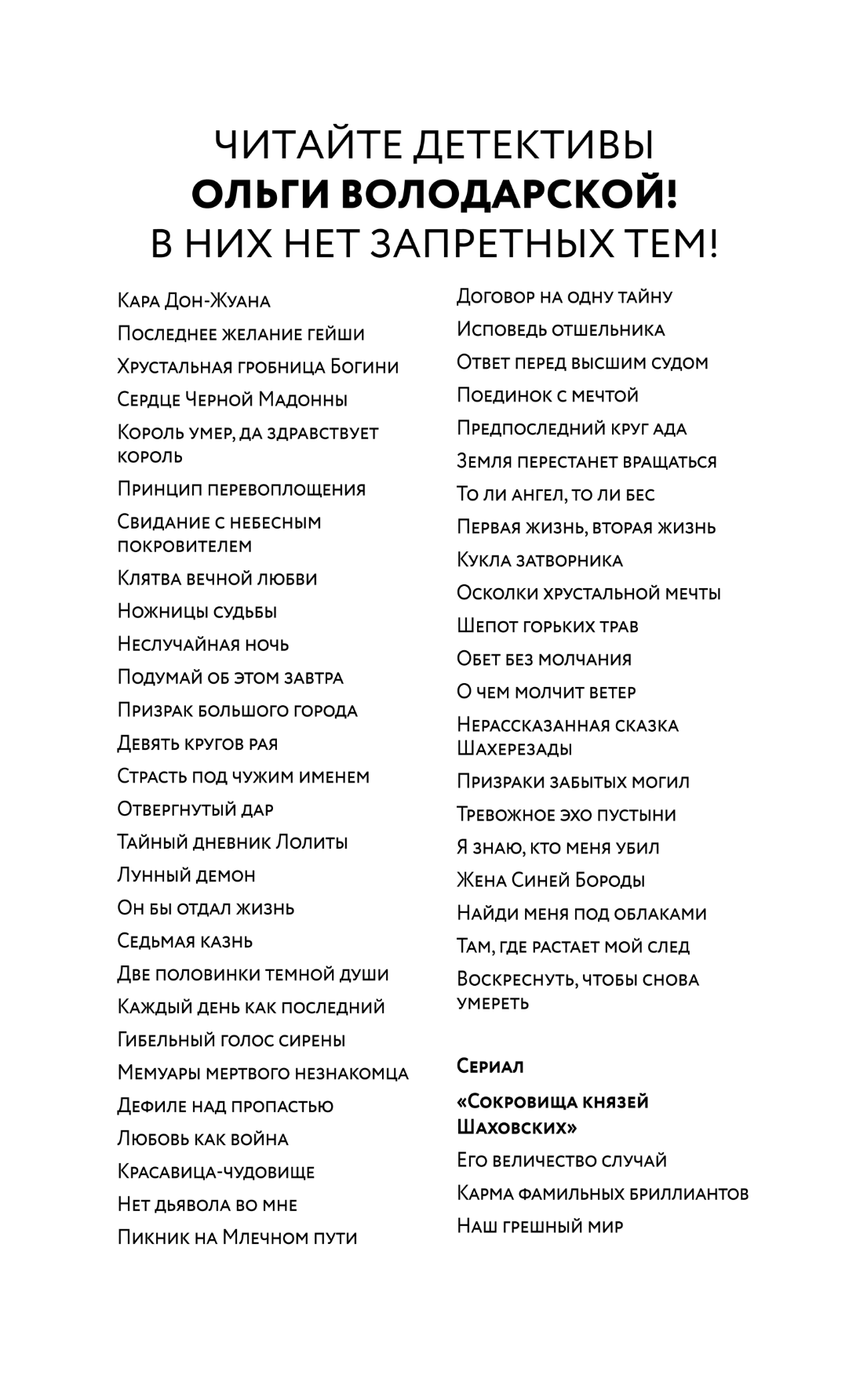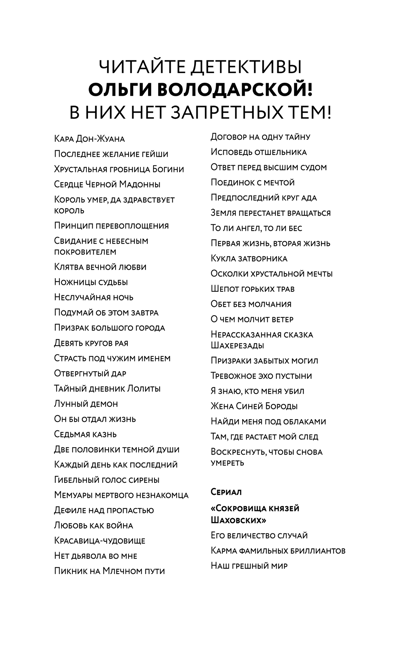 Olga Voldarskaya is a famous writer, the author of more than fifty books in the genre of action-packed novels. Olga Voldarskaya's detective stories combine the sharpness of modern prose and the tension of a psychological thriller. In them you will find everything you wanted, but were afraid to know. That is why the book series in which Olga Voldarskaya’s books are published is called “No Taboo Topics”!