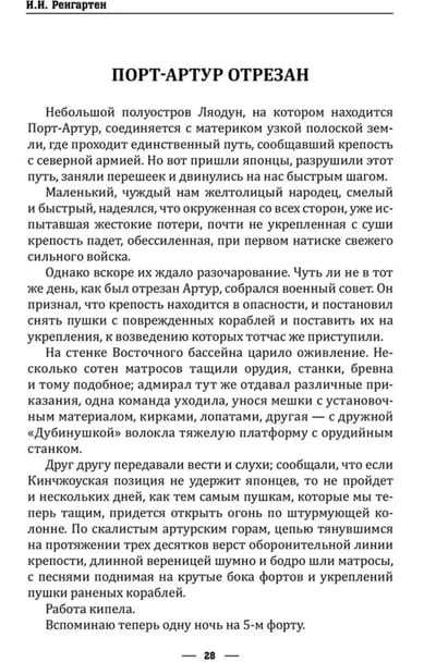 The readers are offered the memoirs of a participant in the defense of Port Arthur, Ivan Ivanovich Rengarten, a Russian naval officer, captain of the 1st rank, inventor of a radio direction finder and founder of the radio intelligence service of the Baltic Fleet. The original text of the book ("Memoirs of a Port Arthurian" / Lieutenant I. I. Rengarten. - St. Petersburg: publication of the Commission for the Management of Capital named after Count S. A. Stroganov, 1910) is reproduced in modern spelling with minor literary corrections.