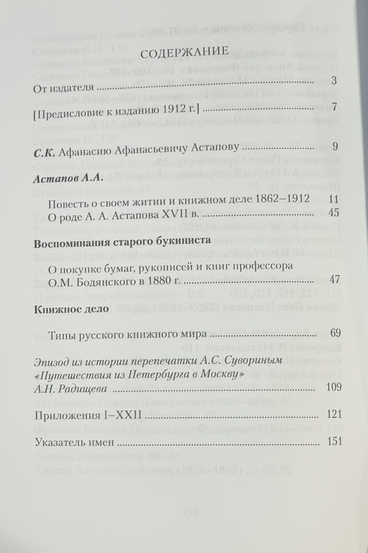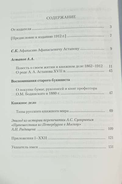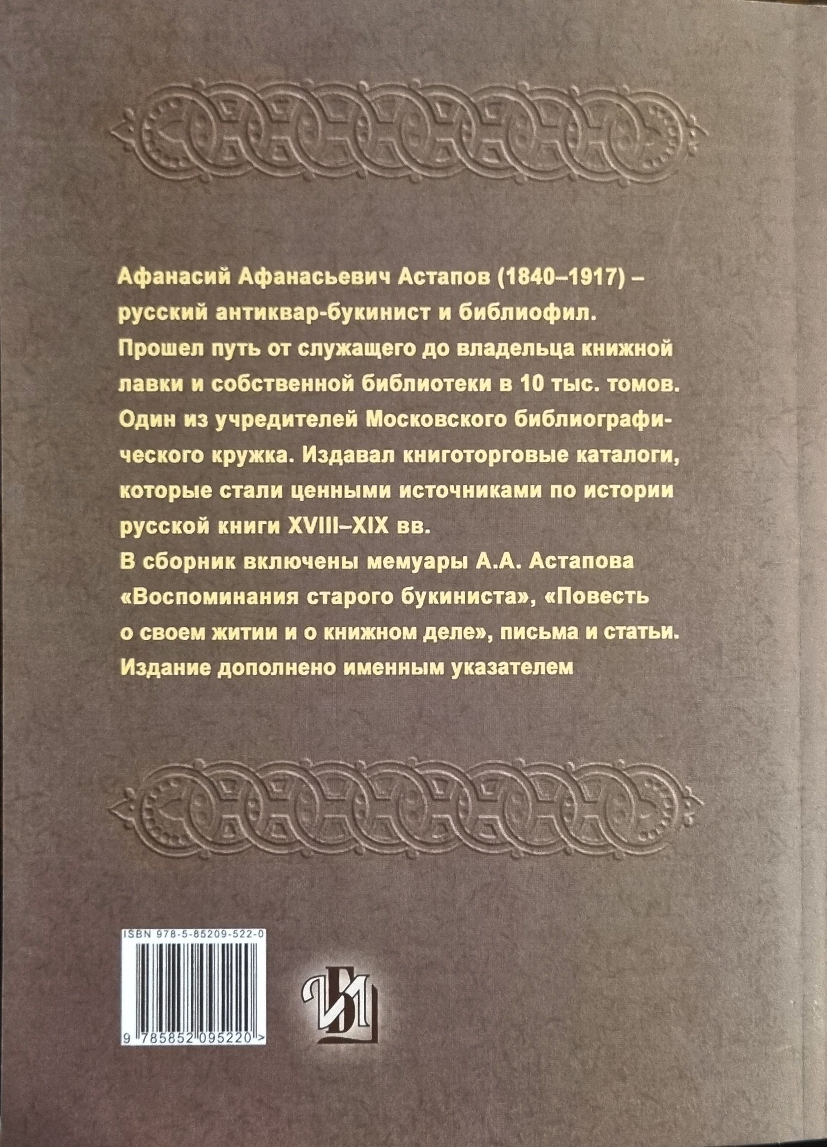 Afanasy Afanasyevich Astapov (1840–1917) was a Russian antiquarian bookseller and bibliophile. He rose from an employee to the owner of a bookstore and his own library of 10,000 volumes. He was one of the founders of the Moscow Bibliographic Circle. He published bookselling catalogues, which became valuable sources on the history of Russian books in the 18th–19th centuries. The collection includes A.A. Astapov’s memoirs, “Memoirs of an Old Bookseller,” “A Tale of His Life and the Book Business,” letters, and articles. The publication is supplemented with a name index.