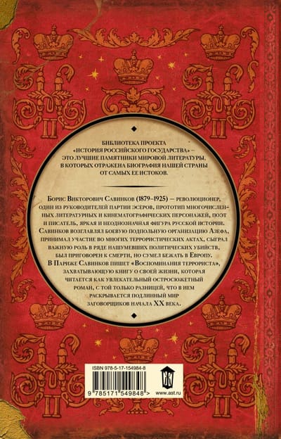 The library of the project "History of the Russian State" is the best monuments of world literature recommended by Boris Akunin, which reflect the biography of our country from its very origins. Boris Viktorovich Savinkov (1879-1925) - revolutionary, one of the leaders of the SR party, the prototype of numerous literary and cinematic characters, poet and writer, a bright and ambiguous figure of Russian history. Savinkov headed the legendary militant underground organization Azef, took part in many terrorist acts, played an important role in a number of sensational political murders, was sentenced to death, but managed to escape to Europe. In Paris, Savinkov wrote "Memories of a Terrorist", a fascinating book about his life, which reads like a fascinating thriller novel, with the only difference that it reveals the true world of conspirators of the early twentieth century.