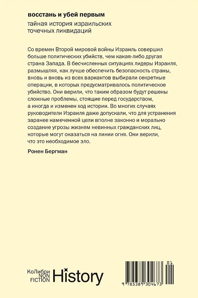 The creation of the State of Israel in 1948 led to the creation of its intelligence service—the deadliest in the world. Its arsenal has always included a special weapon: political assassination. Targeted assassinations have been used countless times, against both large and small enemies, including preemptively. This book is based on previously highly classified archival materials and interviews, none of which were approved by Israel's military elite. Renowned military analyst Ronen Bergman offers a gripping account of targeted assassination programs: their successes and failures, and the moral and political price paid by those who approved and carried out these missions.