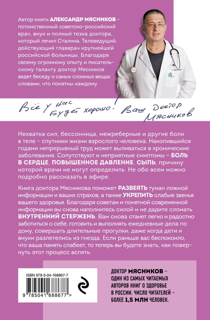Fatigue and lack of strength aggravate chronic diseases or can even cause them. You will learn what truth is contained in the popular expression “all diseases from nerves”. Your emotional background becomes unstable, your mind loses its clarity, words escape your memory. This can worsen relationships with loved ones, cause aggression and causeless tears that you cannot cope with. In his new book, Dr. Myasnikov will explain how to preserve the positive energy of life and prevent negativity from destroying your health.