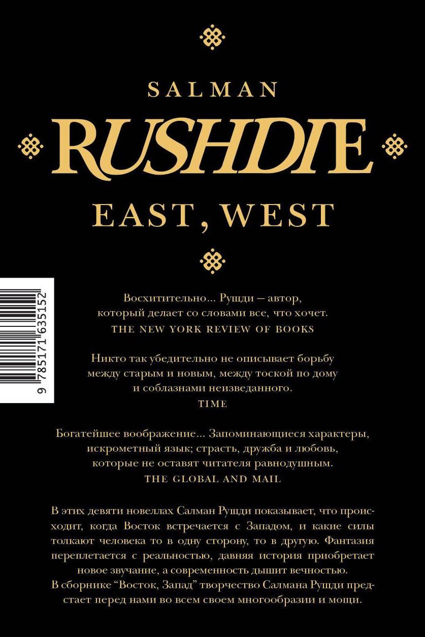 East, West is a collection of short stories about Eastern and Western civilizations, their aspirations and complexities, the failures of globalization and the people facing difficult choices. To varying degrees, the stories reflect Rushdie's own experiences, his life in India and his immigrant life in Britain.