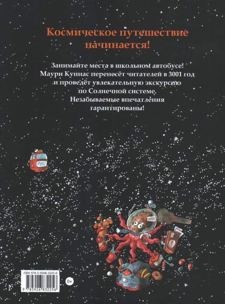 Everything that is described in this book takes place in the distant future - in the year 3001. Space travel has become commonplace, Earthlings live and work on asteroids, Mars, the Moon, and even on distant stars. The inhabitants of other planets are no longer aliens, but friends and acquaintances. Spaceships, UFOs and buses travel at the speed of light (well almost) - and the whole galaxy loves pizza! Grab your seats on the school bus! Mauri Kunnas will lead a fascinating tour of the solar system. An unforgettable experience is guaranteed!