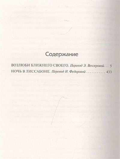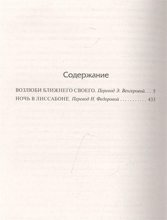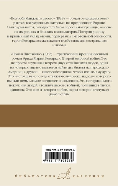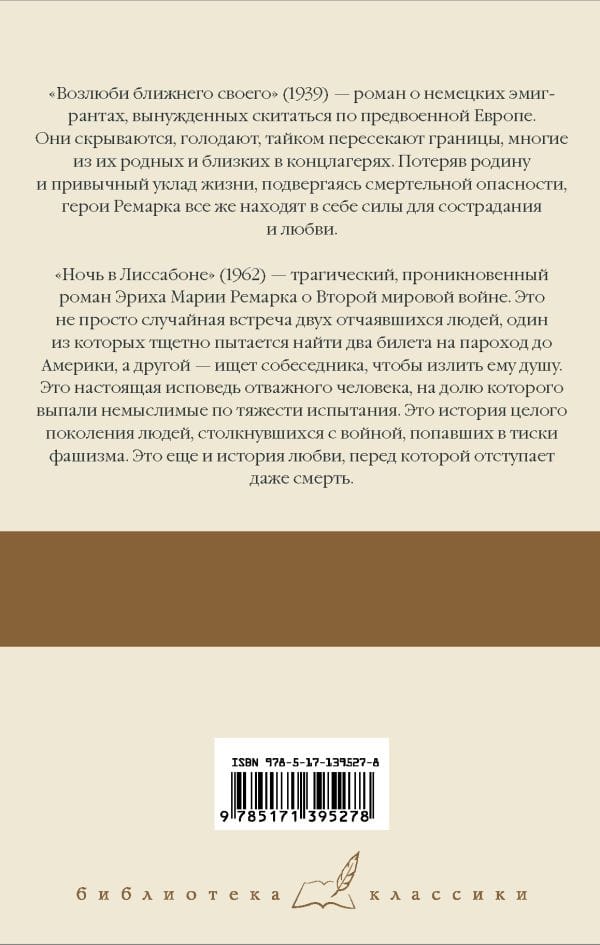 "Love thy neighbor" (1939) is a novel about German immigrants forced to wander through pre-war Europe. They hide, starve, sneak across borders, many of their relatives and friends in concentration camps. Having lost their homeland and the usual way of life, exposed to mortal danger, Remarque's heroes still find the strength for compassion and love. "Night in Lisbon" (1962) - a tragic, heartfelt novel by Erich Maria Remarque about the Second World War. This is not just a chance meeting of two desperate people, one of whom is vainly trying to find two tickets for a steamship to America, and the other - looking for an interlocutor to pour out his soul. This is a true confession of a brave man who has had to endure unimaginable hardships. This is the story of a whole generation of people who faced the war, caught in the grip of fascism. It is also a story of love, before which even death gives way.