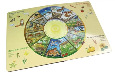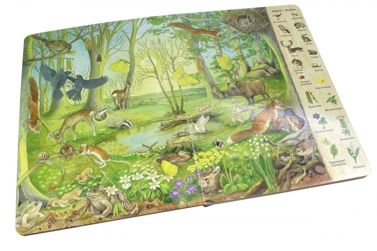 This book will allow you to get acquainted with many "characters" - plants and insects, birds and animals, fish and mushrooms. In a wimmelbuch with dense cardboard pages, there are few spreads, but almost 100 characters! Such a book is suitable for children of any age, broadens the outlook, develops attention and memory, awakens the imagination, allows you to learn many names of animals and plants. Month by month we will learn, observe, notice how nature changes.