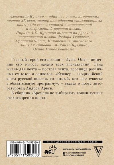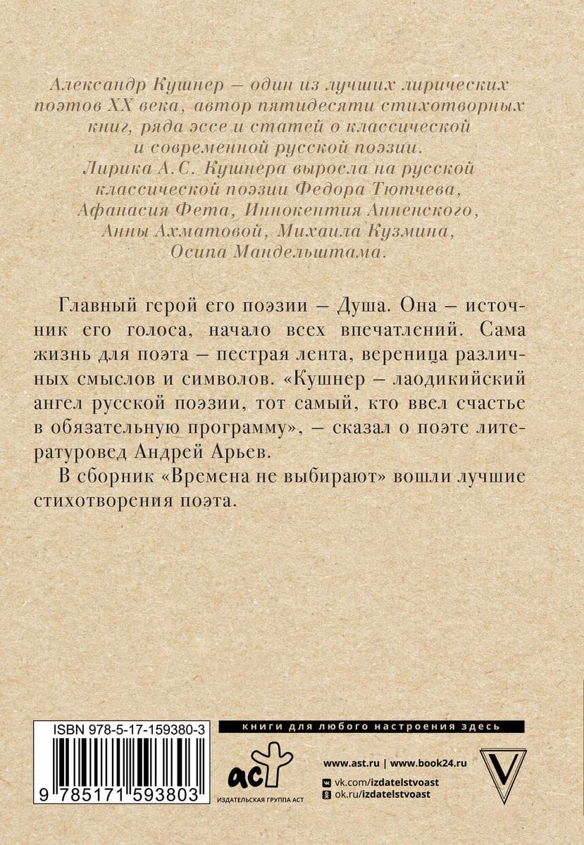 The protagonist of his poetry is the Soul. She is the source of his voice, the beginning of all impressions. Life itself for the poet is a motley ribbon, a string of different meanings and symbols. "Kushner - Laodicean angel of Russian poetry, the very one who introduced happiness in the compulsory program", - said about the poet literary critic Andrei Aryev. The collection "Times do not choose" includes the best poems of the poet.