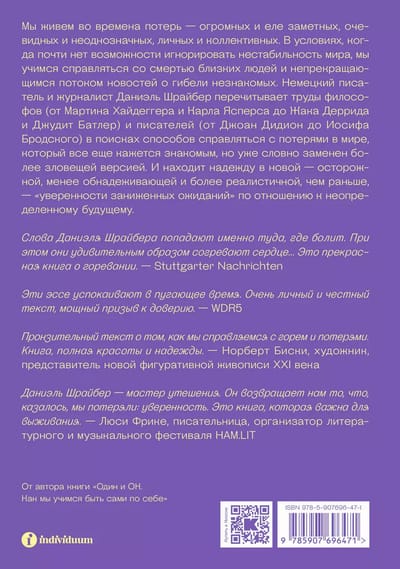 We live in a time of loss—enormous and subtle, obvious and ambiguous, personal and collective. With the world's instability almost impossible to ignore, we learn to cope with the deaths of loved ones and the incessant news of the deaths of strangers. German writer and journalist Daniel Schreiber rereads the works of philosophers (from Martin Heidegger and Karl Jaspers to Jacques Derrida and Judith Butler) and writers (from Joan Didion to Joseph Brodsky) in search of ways to cope with loss in a world that still feels familiar, but has been replaced by a more ominous version. He finds hope in a new—cautious, less hopeful, and more realistic than before—"confidence of diminished expectations" in relation to an uncertain future.