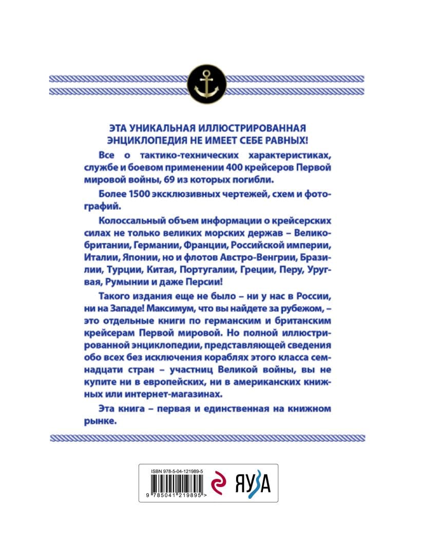 This unique illustrated encyclopedia is unrivaled! All about the tactical and technical characteristics, service and combat use of 392 cruisers of the First World War, 69 of which were lost. More than 1500 exclusive drawings, schematics and photographs. A colossal amount of information about the cruiser forces of not only the great maritime powers - Great Britain, Germany, France, the Russian Empire, Italy, Japan, but also the fleets of Austria-Hungary, Brazil, Turkey, China, Portugal, Greece, Peru, Uruguay, Romania and even Persia! Such an edition has not yet been - neither in Russia, nor in the West! The maximum that you will find abroad is separate books on German and British cruisers of the First World War. But a complete illustrated encyclopedia, representing information about all ships of this class of seventeen countries participating in the Great War, you will not buy in European or American bookstores or online stores. This book is the first and only one on the book market.