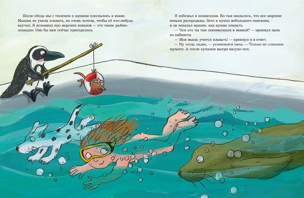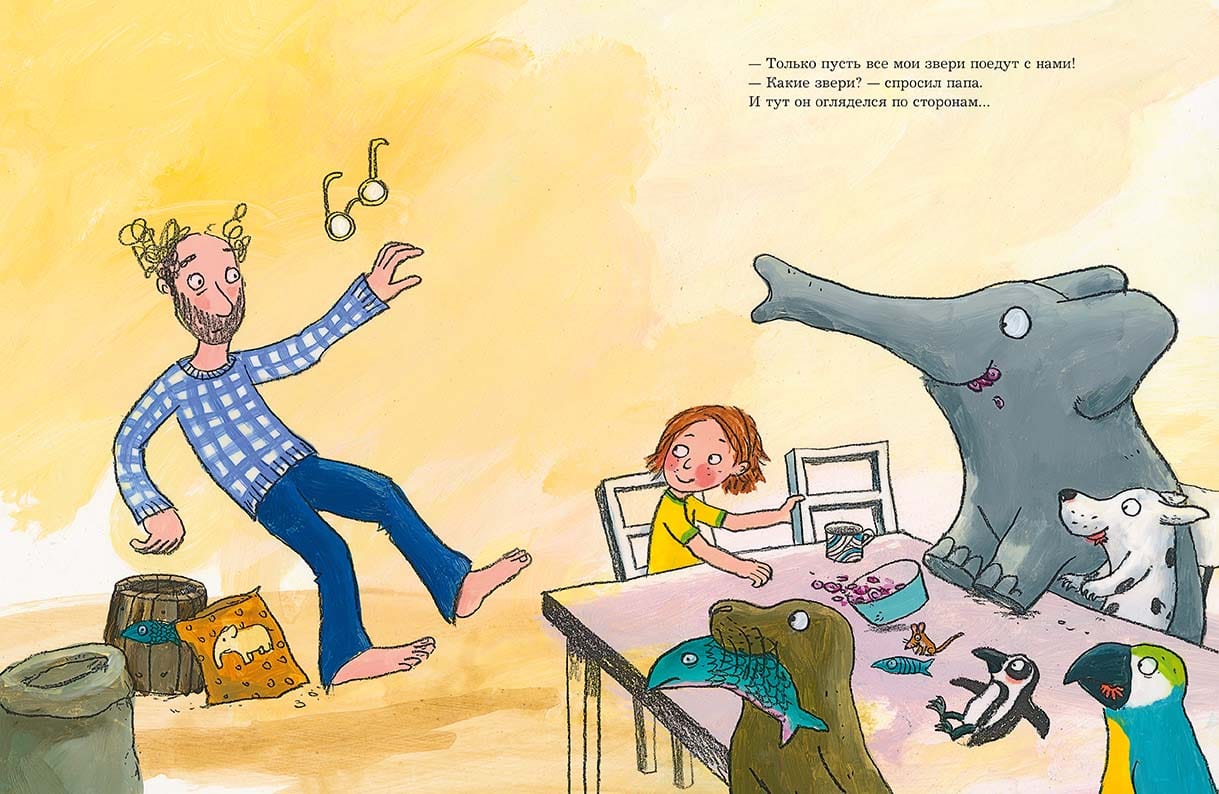 Mika asks for permission to get a pet so that he has someone to spend time with while Daddy is busy. After a bit of thinking, Dad gives Mika his consent and wallet, with which the boy goes to a pet store. There Mika buys himself a sand mouse. And they play hide-and-seek all over the living room. But then the mouse hides so well that Mika goes to the pet store again and this time comes back with a puppy, because dogs have a great sense of smell and they can find anyone. And then... Mika had to run to the pet store a few more times. When Dad finally finished his important project on Sunday and looked around, he found a big group of friends sitting at the kitchen table eating breakfast: Mika with a sand mouse, a puppy, a seal, a penguin, a parrot and an elephant.