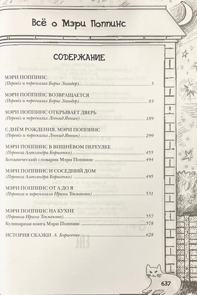The book includes all six fairy tale stories by Pamela Travers: "Mary Poppins", "Mary Poppins Returns", "Mary Poppins Opens the Door", "Happy Birthday, Mary Poppins", "Mary Poppins and the Next House", "Mary Poppins in Cherry Lane". Classic translations by Boris Zakhoder, L. Yakhnin, and A. Borisenko.