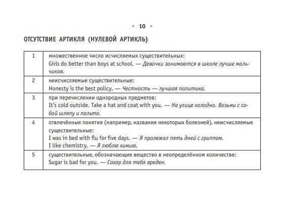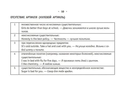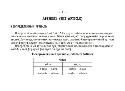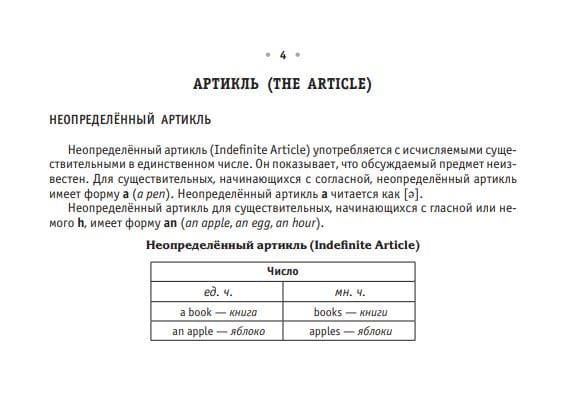 This handy and compact reference book contains all the basic rules of English grammar. The material is presented in the form of tables, which greatly facilitates its perception. The theoretical part is provided with examples of usage with translation into Russian. The handbook is intended for all those who study English.
