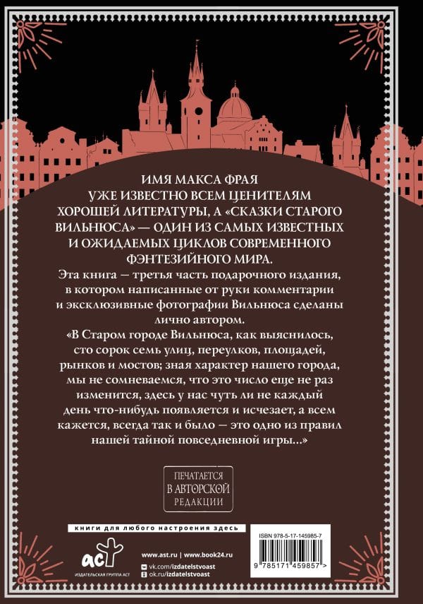 Max Fry's name is already known to all connoisseurs of good literature, and "Tales of Old Vilnius" is one of the most famous and anticipated cycles of the modern fantasy world. This book is the second part of a gift edition with handwritten commentary and exclusive photos of Vilnius taken personally by the author.