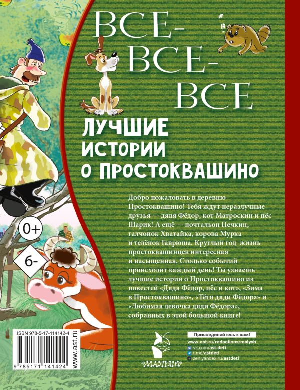 Welcome to the village of Prostokvashino! Uncle Fyodor, Matroskin the cat and Sharik the dog are waiting for you! And also - the letter carrier Pechkin, a galchonok Khvataika, a cow Murka and a calf Gavryusha. All year round life is interesting and rich. So many events happen every day! You will learn the best stories about Prostokvashino from the stories "Uncle Fyodor, Dog and Cat", "Winter in Prostokvashino", "Uncle Fyodor's Aunt" and "Uncle Fyodor's Favorite Girl", collected in this big book!