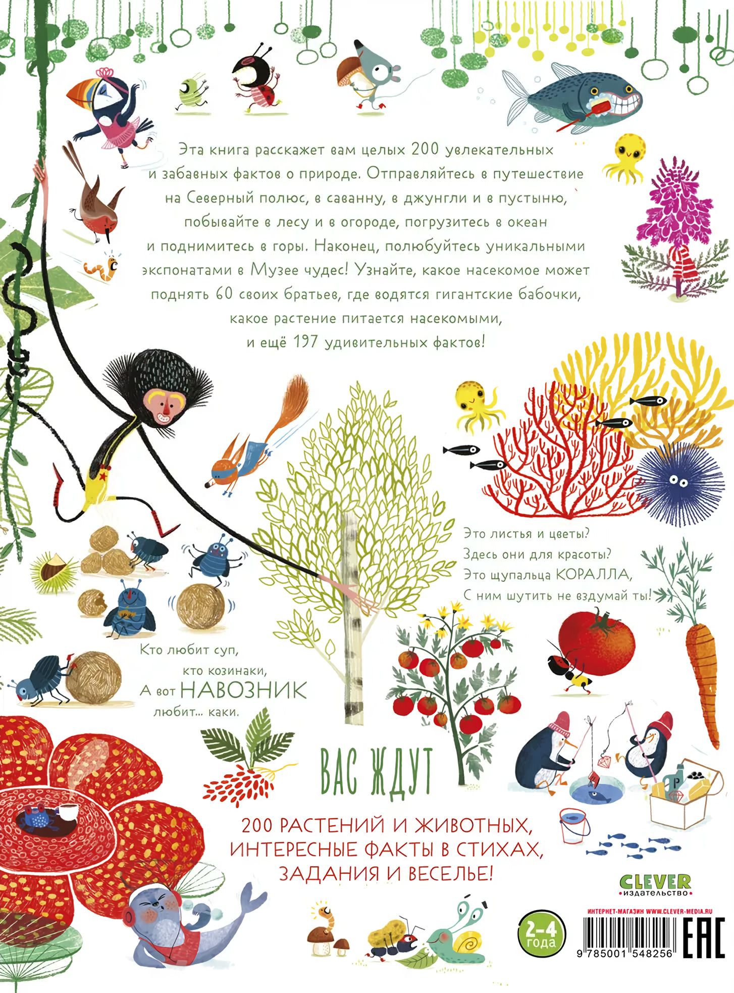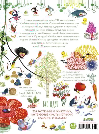 Travel to the North Pole, the savannah, the jungle and the desert, visit the forest and the vegetable garden, dive into the ocean and climb mountains. Finally, admire the unique exhibits at the Museum of Wonders. Learn which insect can lift 60 of its brothers, where giant butterflies are found, which plant feeds on insects, and 197 more amazing facts. Are those leaves and flowers? Are they here for beauty? These are the tentacles of coral, Don't mess with it. Who likes soup, who likes kozinaki, But the dungeness loves... kaki. You will find 200 plants and animals, interesting facts in poems, tasks and fun.
