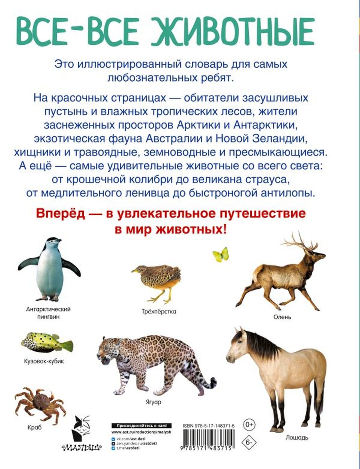 "All the Animals" is a colorfully illustrated dictionary for children. Within its pages, little ones will encounter animals from all over the world: inhabitants of the tropics, oceans, and rivers, representatives of the taiga and tundra, creatures that crawl, jump, swim, and fly. This book will help children take their first steps in exploring the fauna of our planet, learn the names of animals, and broaden their horizons.