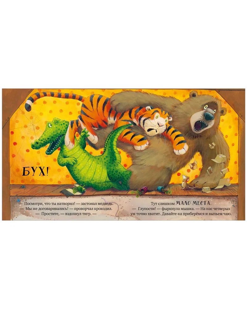 Mouse had been looking for a new house for a long time and finally found the one she dreamed of. But... who jumped out at her from behind the piano? Who roared from the bathroom? Who was it that went tumbling down the stairs?! Looks like it's a bit crowded... Will there be enough room for everyone? The picture book "There's room for everyone!" will show that determination and optimism even little mice can make mountains. It is created for the first reading with kids 3-5 years old: by the large illustrations of the story the child will easily be able to "read" the story, and the text on the pages is just enough so that he does not have time to get bored.
