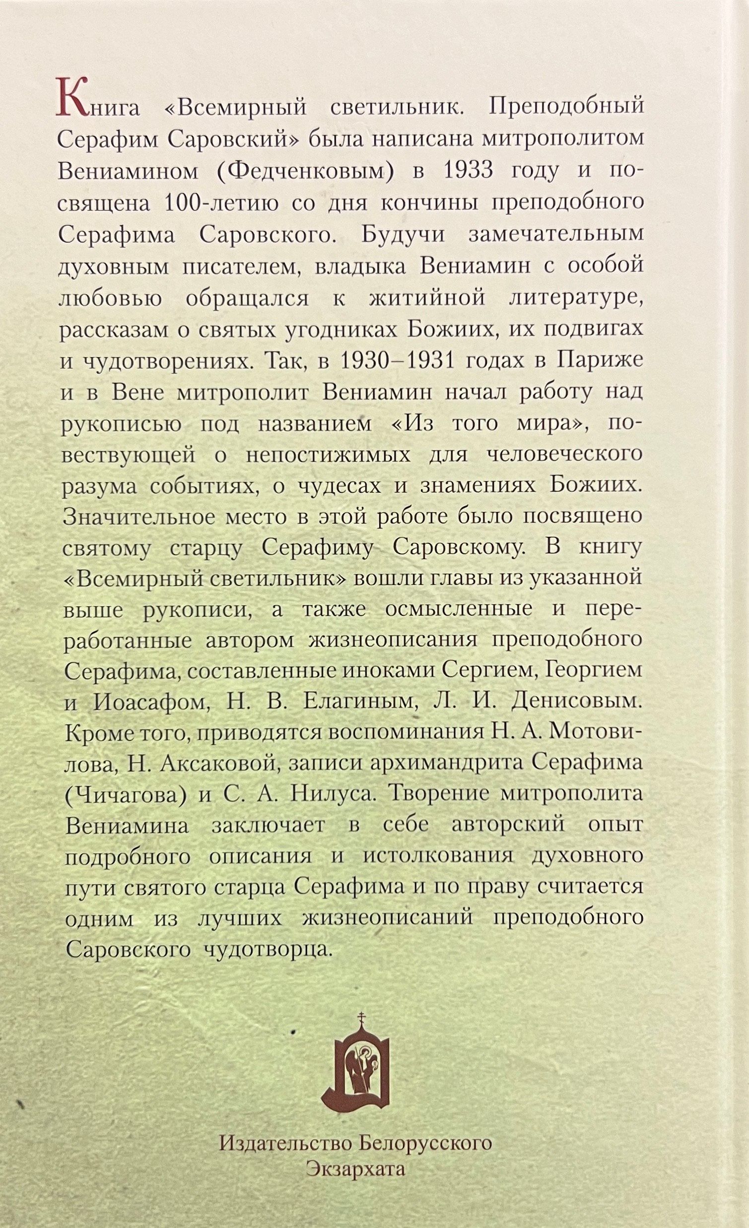 The book "World Luminary" was written by Metropolitan Veniamin (Fedchenkov) in 1933 and is dedicated to the 100th anniversary of the death of St. Seraphim of Sarov.