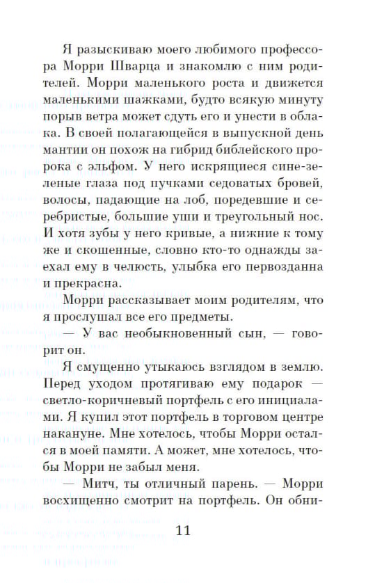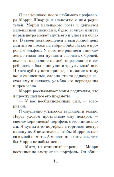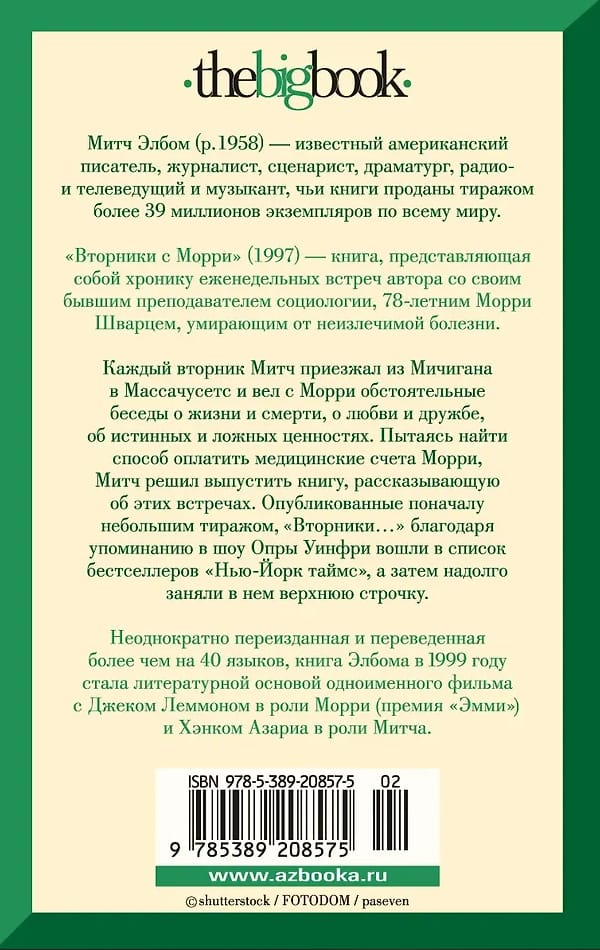 Initially published in a small print run, "Tuesdays…" entered the New York Times bestseller list thanks to a mention on Oprah Winfrey's show, and then remained at the top of the list for a long time. Reprinted numerous times and translated into over 40 languages, Albom's book became the literary basis for the 1999 film of the same name, starring Jack Lemmon as Morrie (Emmy Award-winning) and Hank Azaria as Mitch.