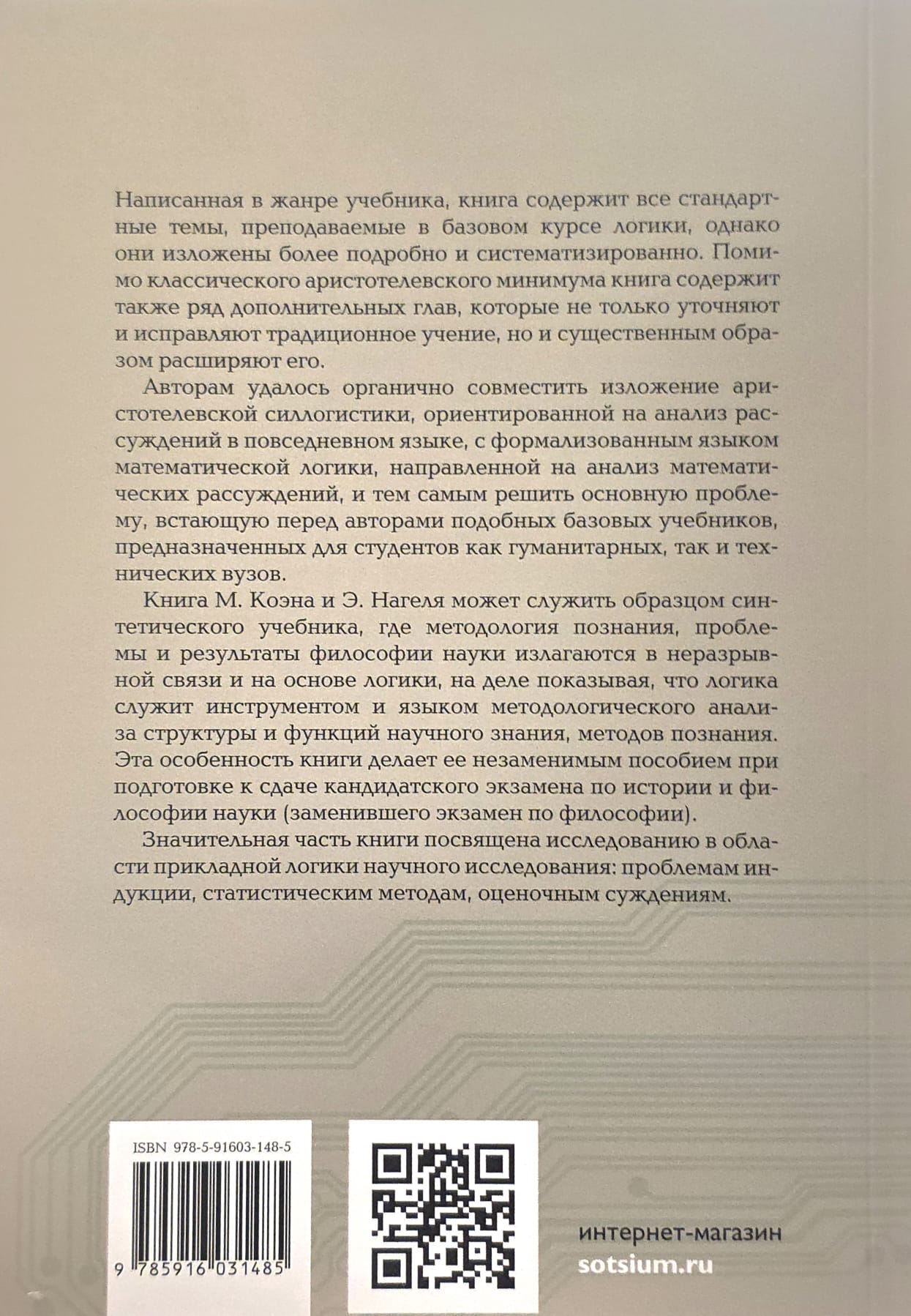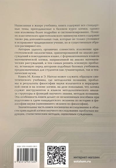 For decades, this book served as the standard textbook on logic and scientific method in most American universities and remains popular (the last English edition was published in 2007). The authors seamlessly combine Aristotle's syllogistic with the formalized language of mathematical logic, and they present the methodology of cognition in close connection with logic. All the standard topics taught in a basic course in logic are covered, and their presentation is more detailed than in standard textbooks. As a synthetic course in logic and scientific methodology, it has no equivalent among Russian textbooks.