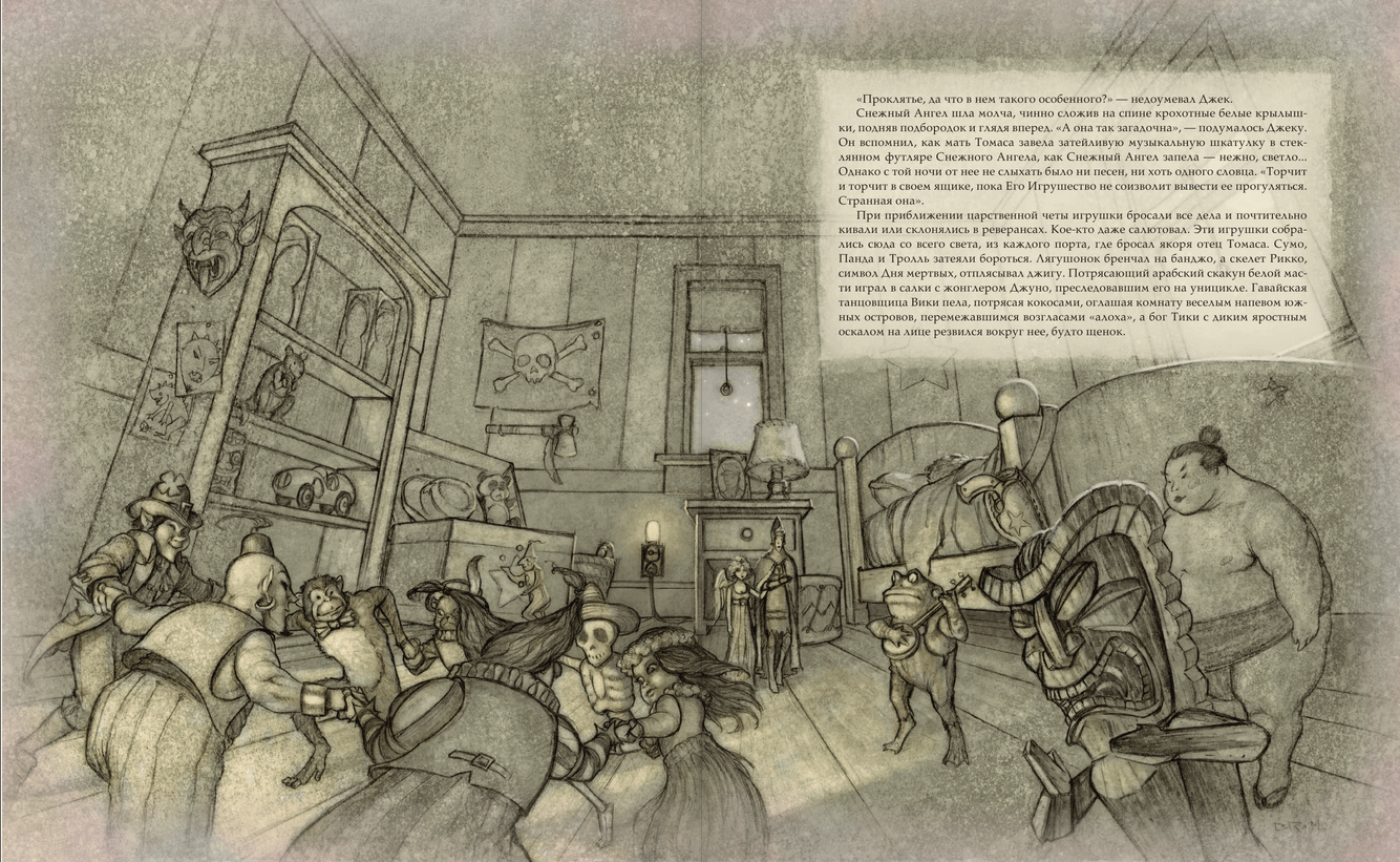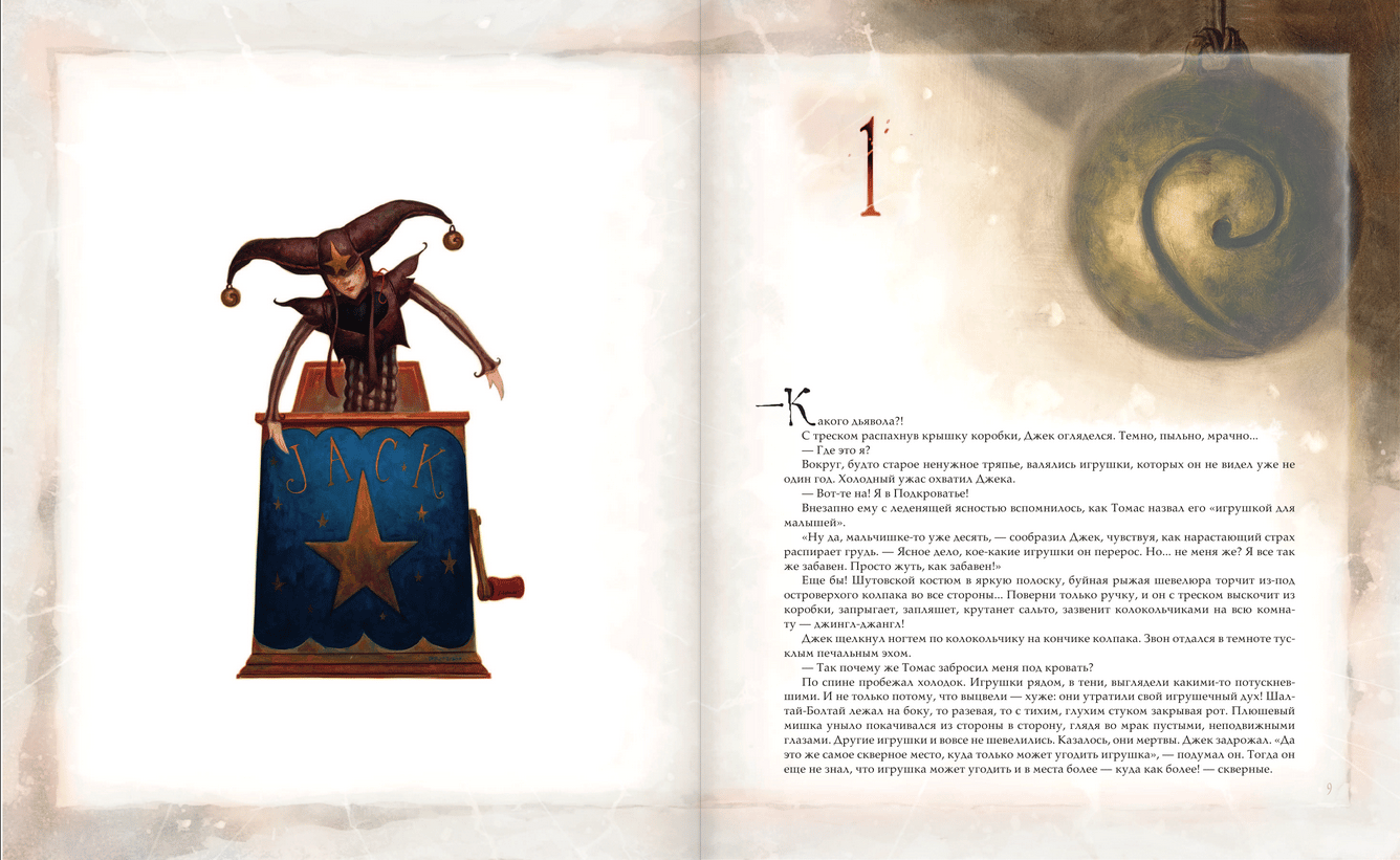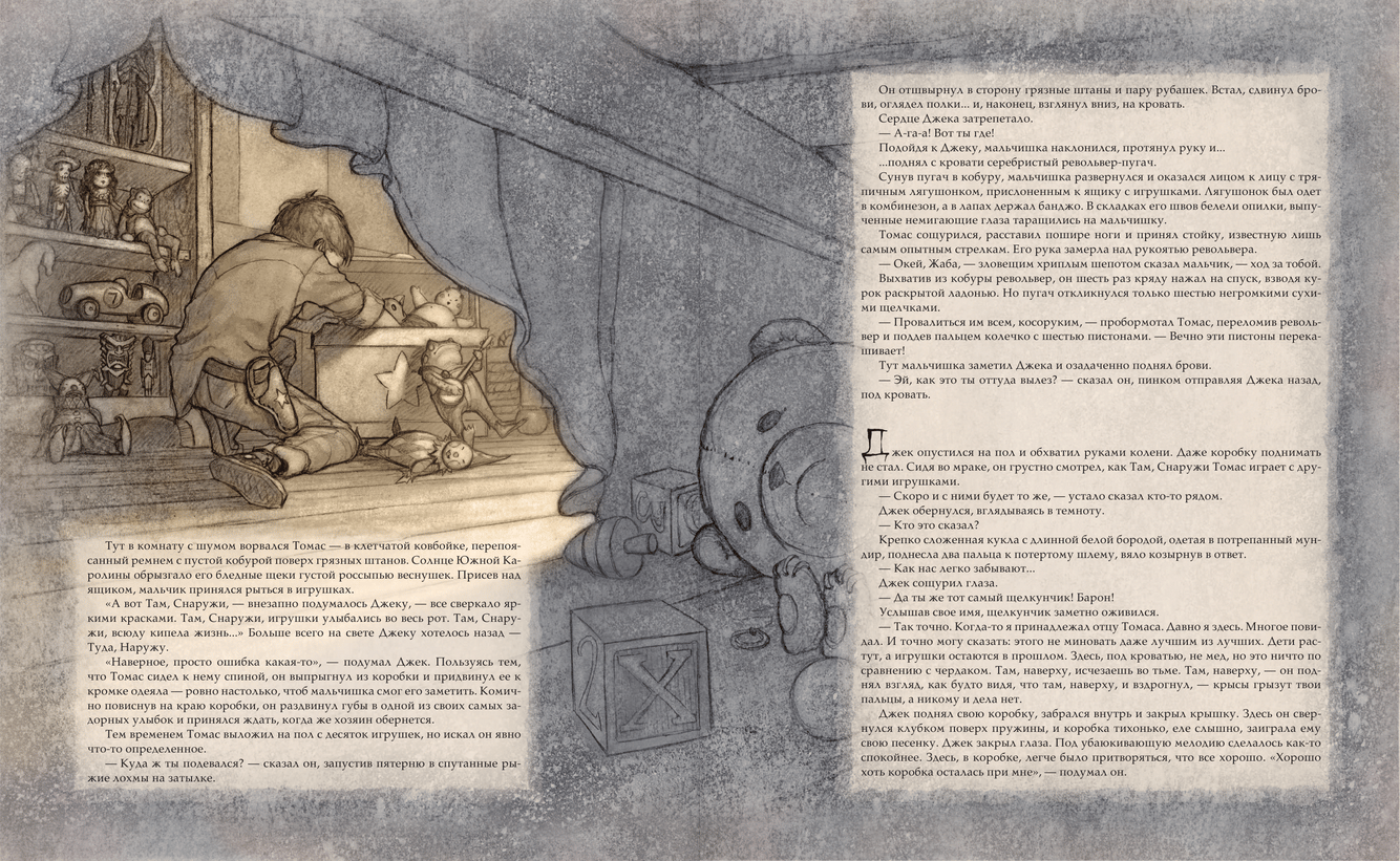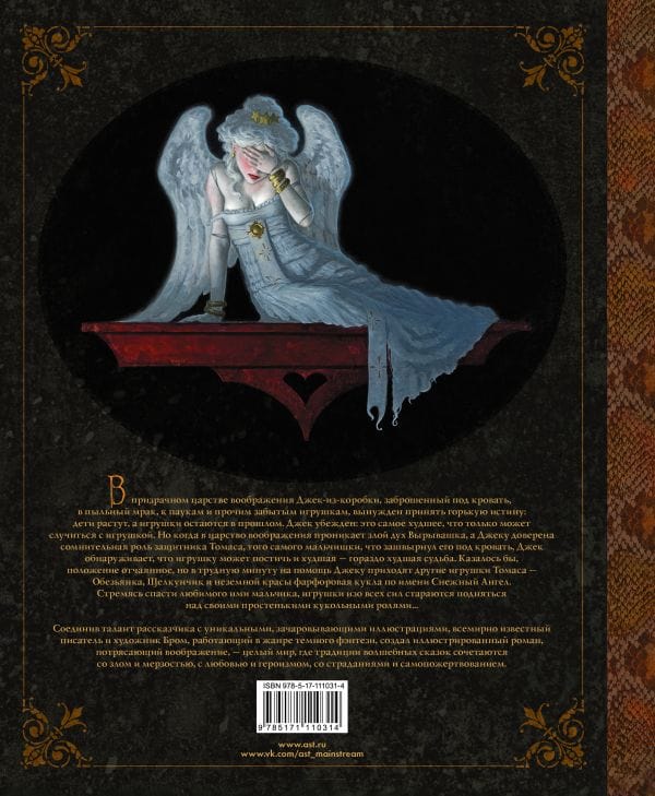 In the ghostly realm of imagination, Jack from the box, abandoned under the bed, in the dusty darkness, to spiders and other forgotten toys, is forced to accept the bitter truth: children grow up, and toys are a thing of the past. Jack is convinced: this is the worst thing that can happen to a toy. But when the evil spirit Vyryshka enters the realm of imagination, and Jack is entrusted with the dubious role of defending Thomas, the very boy who threw him under the bed, Jack discovers that the toy may suffer a worse - much worse - fate. It would seem that the situation is desperate, but in a difficult moment to help Jack come to the aid of other toys Thomas - Monkey, Nutcracker and unearthly beauty of a porcelain doll named Snow Angel. Struggling to save the boy they love, the toys struggle to rise above their simple puppet roles ... Combining the talent of a storyteller with uniquely enchanting illustrations, world-renowned writer and artist Brom, working in the dark fantasy genre, has created an illustrated novel that shocks the imagination - an entire world where the traditions of magical fairy tales combine with evil and abomination, with love and heroism, with suffering and sacrifice.