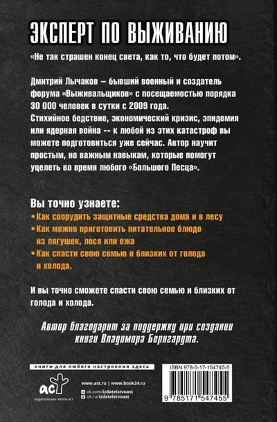 Dmitry Lychakov is a former military man and the creator of the forum "Survivalists" with the attendance of about 30 000 people per day since 2009. Natural disaster, economic crisis, epidemic or nuclear war -- you can prepare for any of these disasters now. The author will teach you simple but important skills that will help you survive any "Big Sandy".