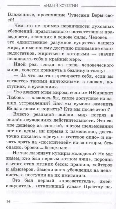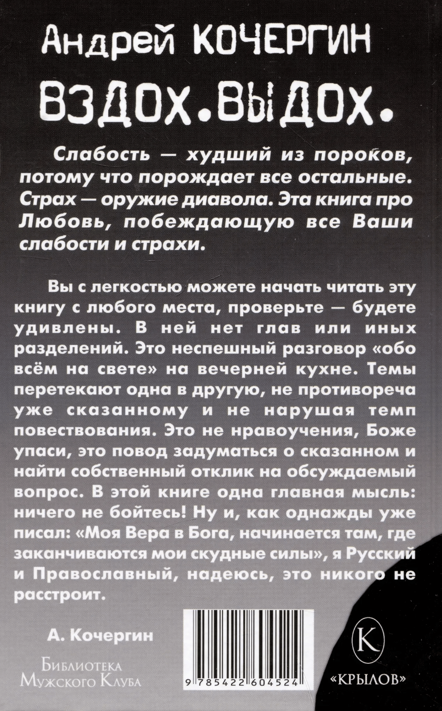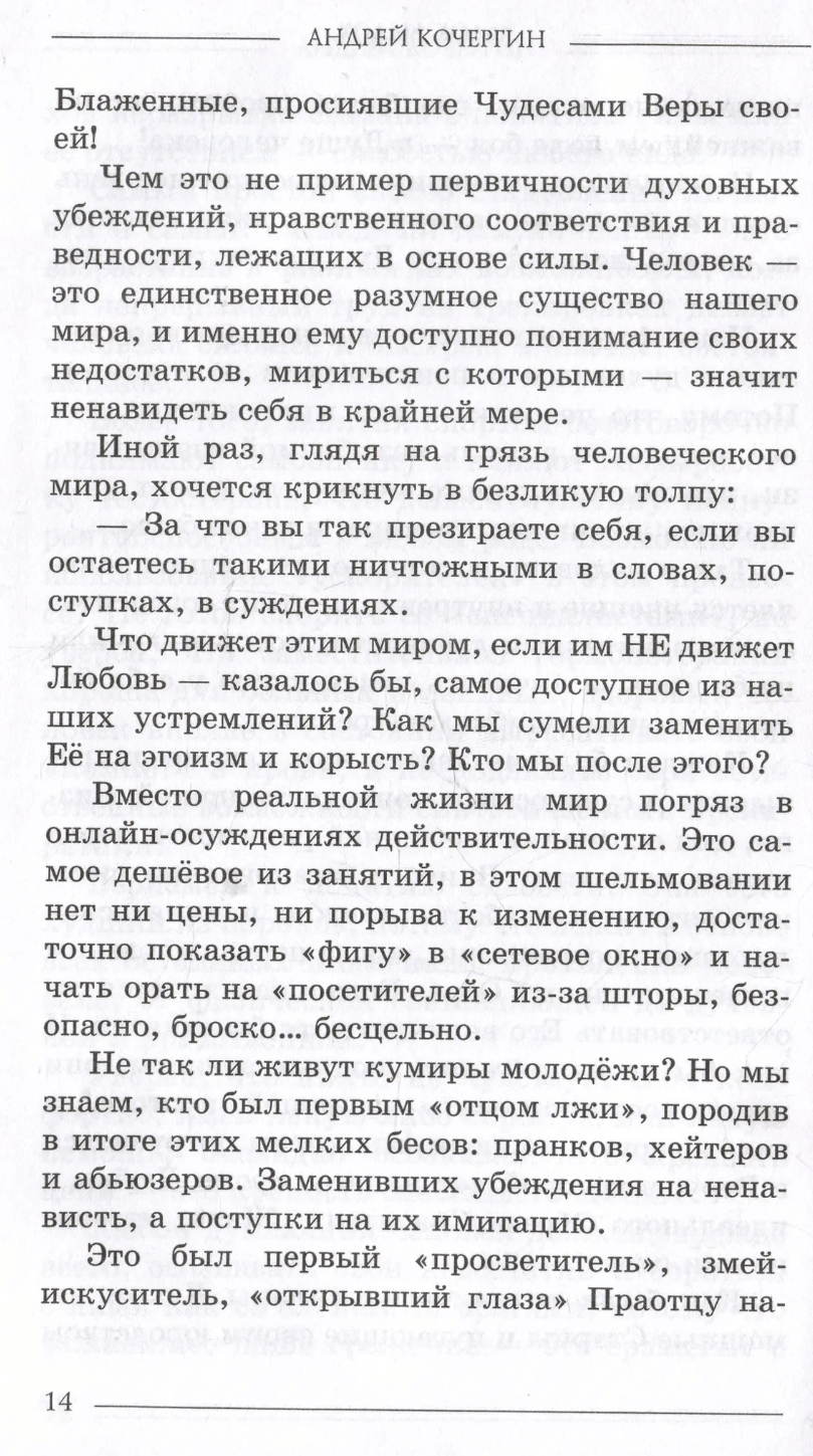 You can easily start reading this book from any place, check it out and you will be surprised. There are no chapters or other divisions. This is a leisurely conversation “about everything in the world” in the evening kitchen. The topics flow into one another, without contradicting what has already been said and without disrupting the pace of the narrative. This is not a moral lesson, God forbid, this is a reason to think about what has been said and find your own response to the issue under discussion. This book has one main idea: do not be afraid of anything! Well, as I once wrote: “My Faith in God begins where my meager strength ends,” I am Russian and Orthodox, I hope this will not upset anyone.