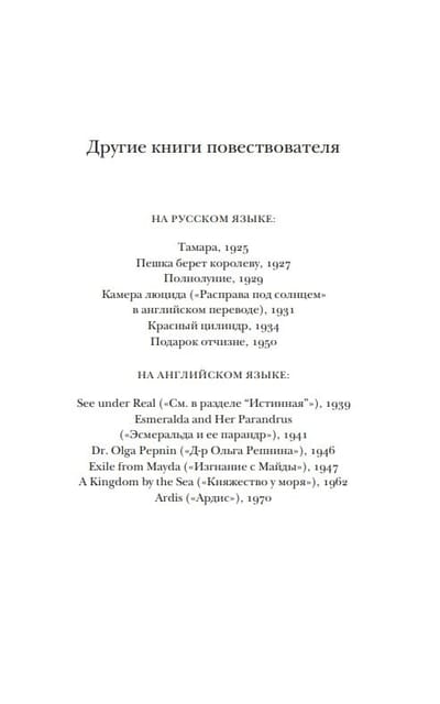 This edition also includes the unfinished novel "Solus Rex," consisting of two chapters: "Ultima Thule" and "Solus Rex." Although never published in its entirety, the novel is an important precursor to Nabokov's English-language works, particularly "Pale Fire." The events of the first chapter unfold in the real world, while the second takes place in a semi-mythical northern kingdom. The characters' stories intersect and intricately reflect each other, and attentive readers will have to discern what lies between truth and fantasy.