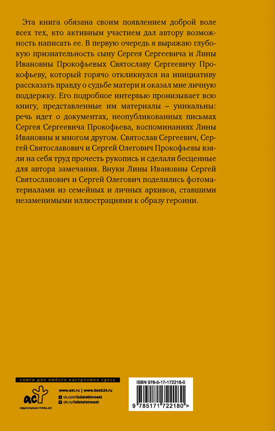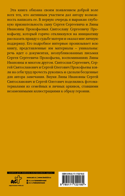 The great Russian composer's first wife, Lina Kodina-Prokofieva, lived a long life, spanning almost a century. She spent twenty years with Prokofiev in America, Europe, and then the Soviet Union, interacting with Rachmaninoff, Stravinsky, Horowitz and Toscanini, Diaghilev and Balmont, Picasso and Matisse, Meyerhold and Eisenstein… She experienced family breakdown, arrest, prison, and Soviet labor camps. She was an outstanding figure, worthy of her brilliant husband. However, until her very last years, we knew nothing about her: Soviet censorship erased Lina from both Prokofiev's life and from history.