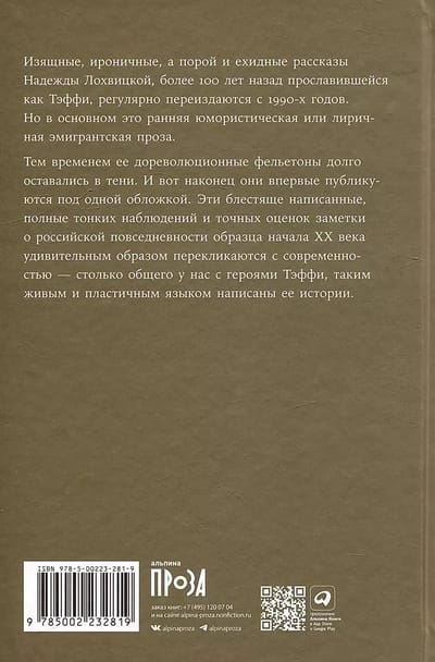 Meanwhile, her pre-revolutionary feuilletons remained in the shadows for a long time. And now, at last, they are published for the first time under one cover. These brilliantly written notes on Russian everyday life in the early twentieth century, full of subtle observations and accurate assessments, resonate with the present day in a surprising way - we have so much in common with Taffy's characters, and her stories are written in such a lively and malleable language.