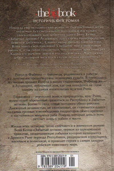 Romulus and Fabiola are twins born into slavery, and from childhood they are destined for an unenviable fate. At the age of thirteen, their master sells Romulus to a gladiator school, while Fabiola is sold to the Lupanarium, a brothel, where she falls for one of the most powerful men in Rome. Tarquinius is an Etruscan warrior and soothsayer, an enemy of Rome, doomed to fight for the Republic in the Forgotten Legion. Brennus is a Gaul whose family was killed by the Romans. Driven by hatred, unbroken, he becomes one of the most formidable and invincible gladiators of his time - and the mentor of the boy-slave Romulus, who day and night dreams of nothing but escape and revenge. The lives of these four are closely intertwined in Ben Kane's epic novel The Forgotten Legion, the first of a trilogy of the same name, whose gripping events begin in ancient Rome of the Republic period, torn by corruption, violence, and politics, and take the heroes to the farthest reaches of the known world.