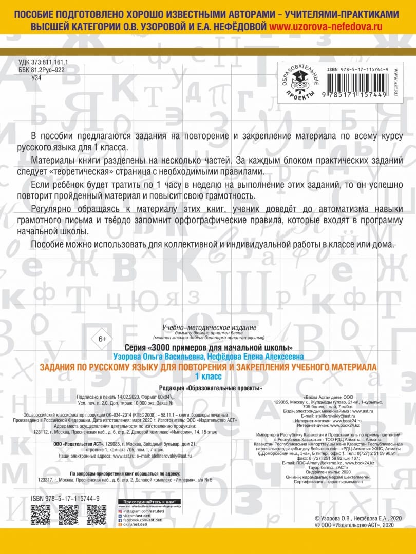 The manual offers tasks for repetition and consolidation of material for the entire course of Russian language for the 1st grade. The materials of the book are divided into several parts. Each block of practical tasks is followed by a "theoretical" page with the necessary rules. If a child spends 1 hour a week on these tasks, he will successfully repeat the material and improve his literacy. Regularly referring to the material in these books, the pupil will bring to automaticity the skills of grammatical writing and firmly remember the spelling rules that are part of the elementary school curriculum. This book can be used for group and individual work in the classroom or at home.