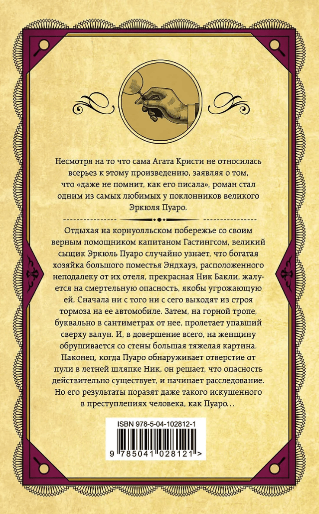 Despite the fact that Agatha Christie herself did not take this work seriously, stating that she "does not even remember writing it," the novel has become one of the most favorite among fans of the great Hercule Poirot. Vacationing on the Cornish coast with his faithful assistant Captain Hastings, the great detective Hercule Poirot accidentally learns that the wealthy mistress of a large estate Endhouse, located near their hotel, the beautiful Nick Buckley, complains of mortal danger, allegedly threatening her. First, out of the blue, the brakes on her automobile fail. Then, on a mountain trail, just centimeters away from her, a boulder falls from above. And, to top it all off, a large heavy painting falls from the wall onto the woman. Finally, when Poirot discovers a bullet hole in Nick's summer hat, he decides that there is indeed danger and begins to investigate. But its results will astonish even a man as adept at crime as Poirot....
