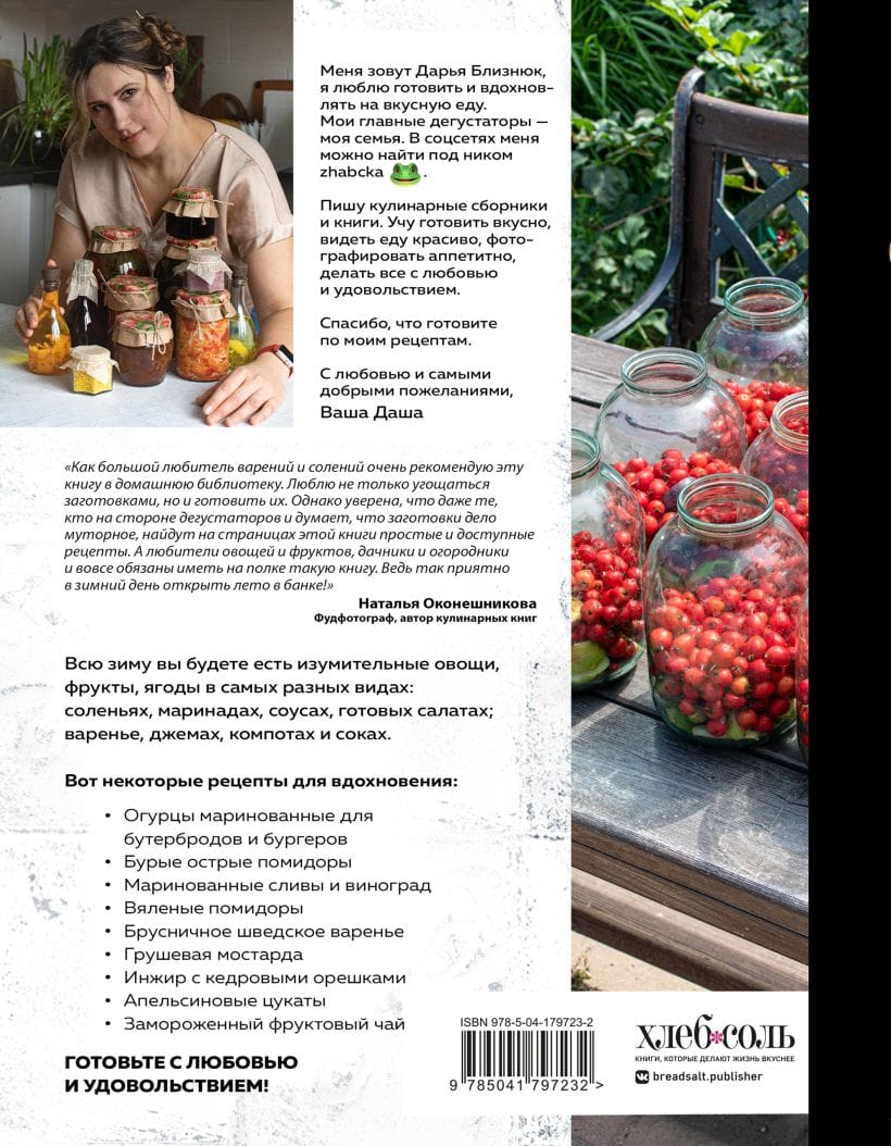 Dasha Bliznyuk has a long-established and growing audience of fans. She is both on VKontakte and on Telegram. Her recipes are recognized, waited for, cooked according to them and posted happy reviews. Because everything turns out very tasty. This book is the fifth. The first was about Easter, then about cakes, the author has not forgotten about family dinners and the magic of pies. And now she has introduced her very favorite topic of canning. First, in the beginning, Dasha tells how she prepares for this process. Secondly, of course, she offers more than 50 recipes for vegetable and fruit preserves, salads and appetizers, sauces, which are now in special demand, and drinks. All dishes are cooked and photographed by the author, accompanied by sound advice and her direct emotions. Delicious, healthy, cozy!