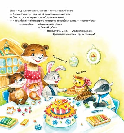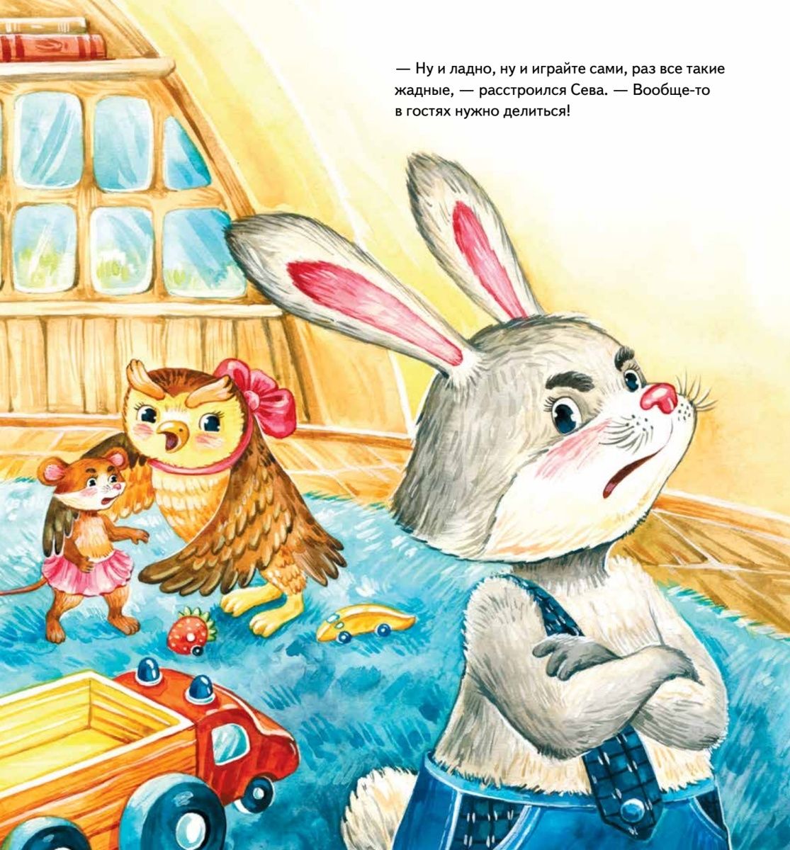 Seva the bunny loves to visit Misha the bear. The friend has so many toys that the bunny doesn't have at home! I wish I could play with them all! But it turns out that not all animals easily share their cars, cubes and balls ... What happened to Seva, you will learn from the tale, instructive and useful. This is not just a beautifully illustrated story about a restless bunny and his friends for family reading, but also material for a conversation "What is good and what is bad". At the end of the book there are questions compiled by a child psychologist for discussion with the child. The book is recommended for parents, educators, teachers. Useful tales educate the child without shouting and punishment! For reading by adults to children.