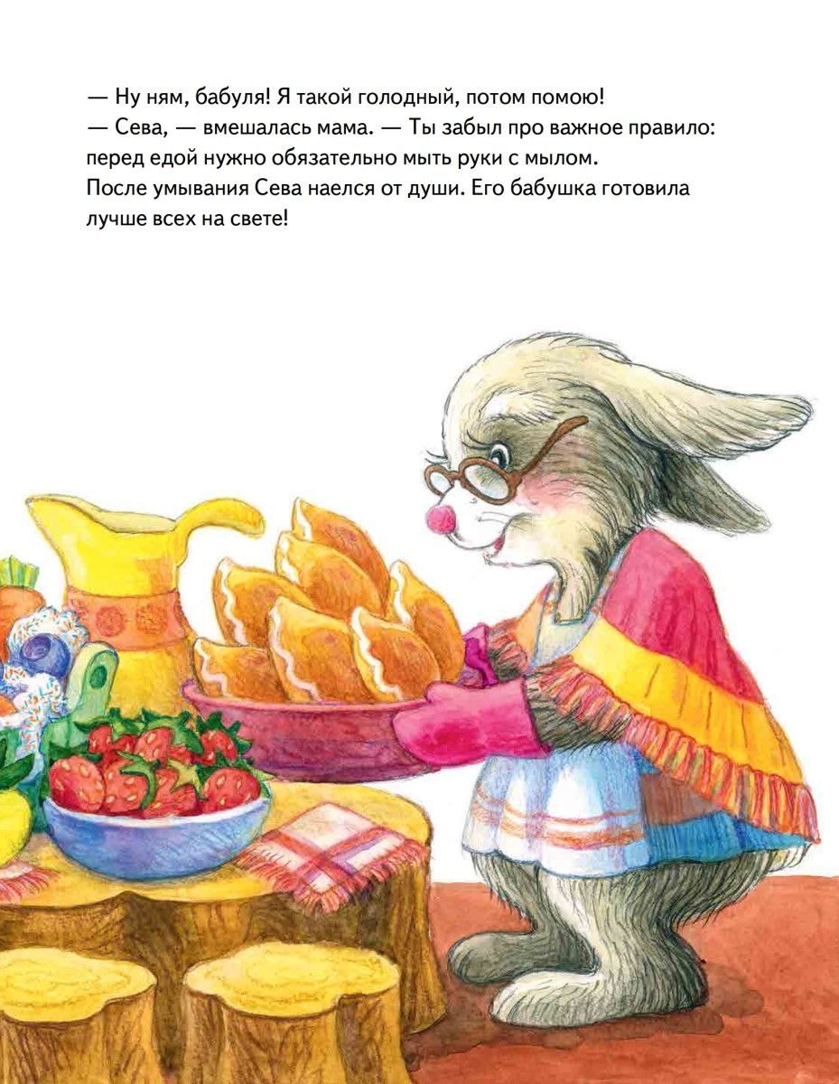 What's the best thing to do in the summer? Of course, go on a quest for adventure! For example, to your grandmother's village, where you can find real treasures! In this new book, Seva the bunny goes to visit his grandmother and learns why to put a panama hat on his head, how to save himself from mosquitoes, and how to behave near a body of water. This is not just a beautifully illustrated story about a restless bunny and his friends for family reading, but also material for a conversation "What is good and what is bad". At the end of the book there are questions compiled by a child psychologist for discussion with the child. The book is recommended for parents, educators, teachers. Useful tales educate the child without shouting and punishment! For reading by adults to children.