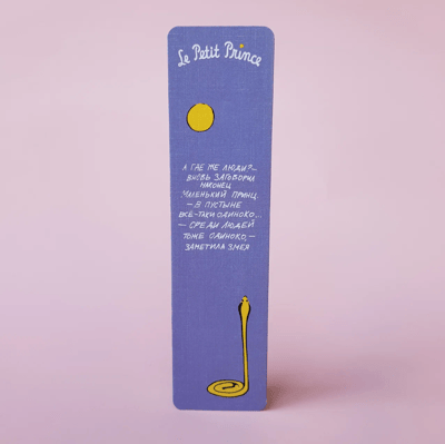 An elegant bookmark on designer cardboard is made in pastel colors, decorated with an illustration and a quote from everyone's favorite book, "The Little Prince".