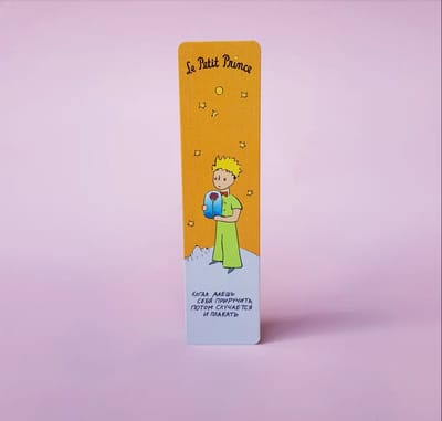 An elegant bookmark on designer cardboard is made in pastel colors, decorated with an illustration and a quote from everyone’s favorite work “The Little Prince”.