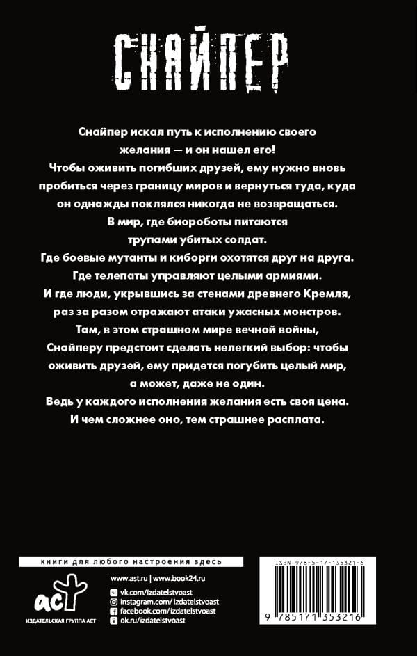 Continuation of the adventures of the legendary Sniper! To revive his fallen friends, Sniper must once again break through the border of worlds and return to the place he swore he would never return to. A world where telepaths control entire armies, mutant warriors and cyborgs hunt each other, and biorobots feed on the corpses of dead soldiers. A world where people sheltered behind the walls of the ancient Kremlin repel the attacks of terrible monsters time after time. Back in the land of eternal war, Sniper is faced with a difficult choice: is he ready to destroy the whole world for the sake of resurrection of his friends. And perhaps even more than one. Every wish has its price. And the more difficult the wish, the more terrible the payback.