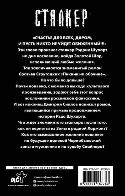 "Happiness for all, for free, and let no one go away offended!" These words were uttered by stalker Redrick Schuchart at the bottom of the excavation, having found the Golden Ball that fulfills any wish. This is how the Strugatsky brothers' famous novel "Picnic on the Sidewalk" ends. But what happened next? For more than forty years, since the release of the cult work, fans of Russian science fiction ask themselves this question. And finally Dmitry Sillov wrote a novel that is a direct continuation of the story of Red Shuhart. What awaits the famous stalker after he returns from the Zone to his native Harmont? How his expressed desire will affect the future of the distant Chernobyl exclusion zone and the fate of the Sniper?