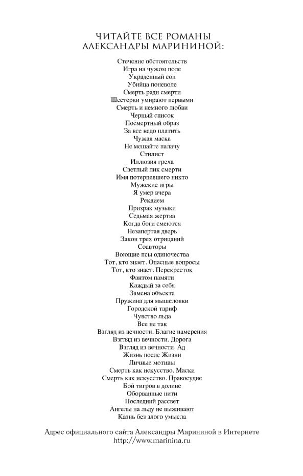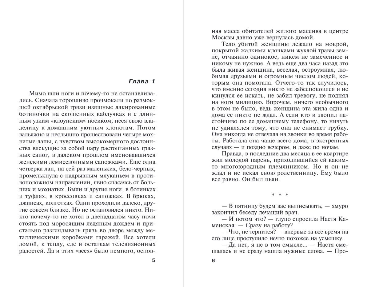 Nastya Kamenskaya is unlucky—she's been in an accident. She'll be discharged from the hospital soon, but her broken leg continues to hurt, making it difficult for her to walk. She decides to seek help from a specialist who uses alternative treatment methods. But when Nastya calls the number she needs, she discovers the specialist has been killed. And then comes another disaster. After her hospital stay, Nastya has nowhere to live: her apartment is occupied by unexpectedly arriving relatives. So Nastya ends up at a friend's dacha, where she takes therapeutic walks and amuses herself by discussing the details of the latest high-profile murder of a young movie star with colleagues. And then, to her horror, she discovers that someone is following her...