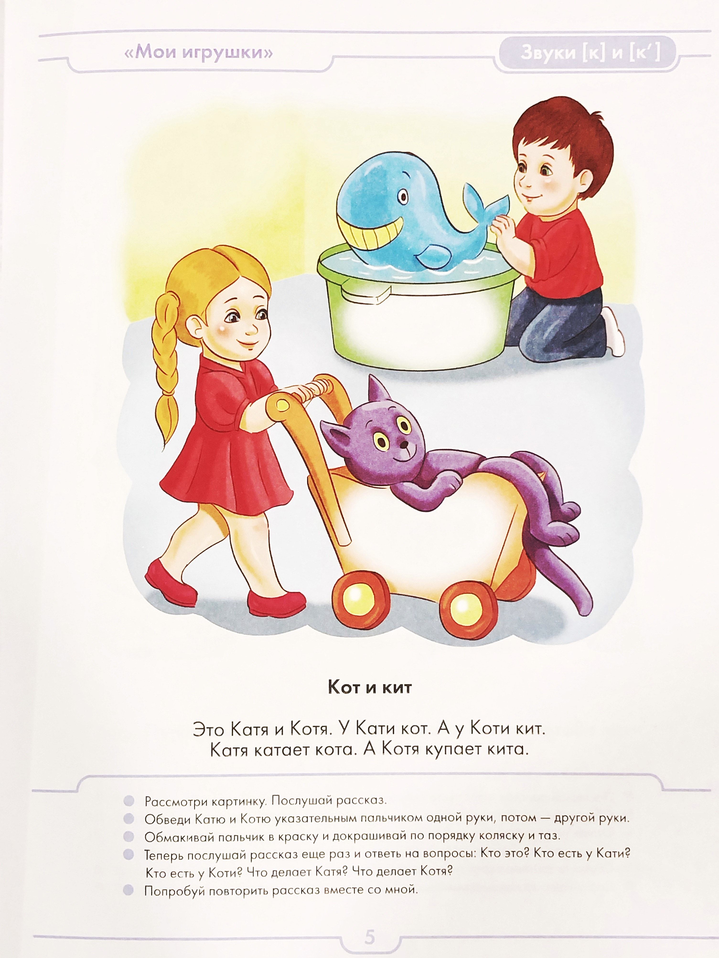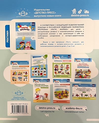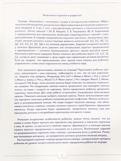 The educational notebook "Working with a speech therapist" presents short stories for preschoolers of the third year of life, filled with simple sounds of the Russian language (sounds of early ontogenesis). Work on the stories will help to cause in children phrase speech (simple sentences), prepare for the formation of retelling skills, will help to clarify the pronunciation of sounds of early ontogenesis. The notebook offers children tasks for coloring pictures and developing fine motor skills, which are directly related to speech development.